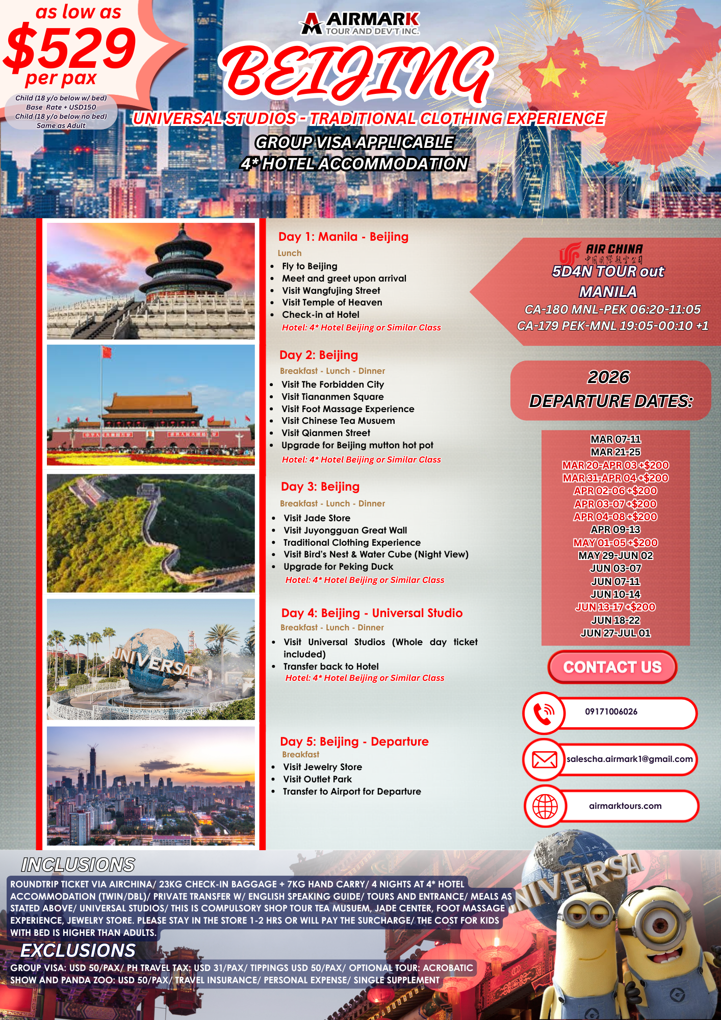- Optional Tour: Acrobatic Show & Panda Zoo USD 50/PAX;
