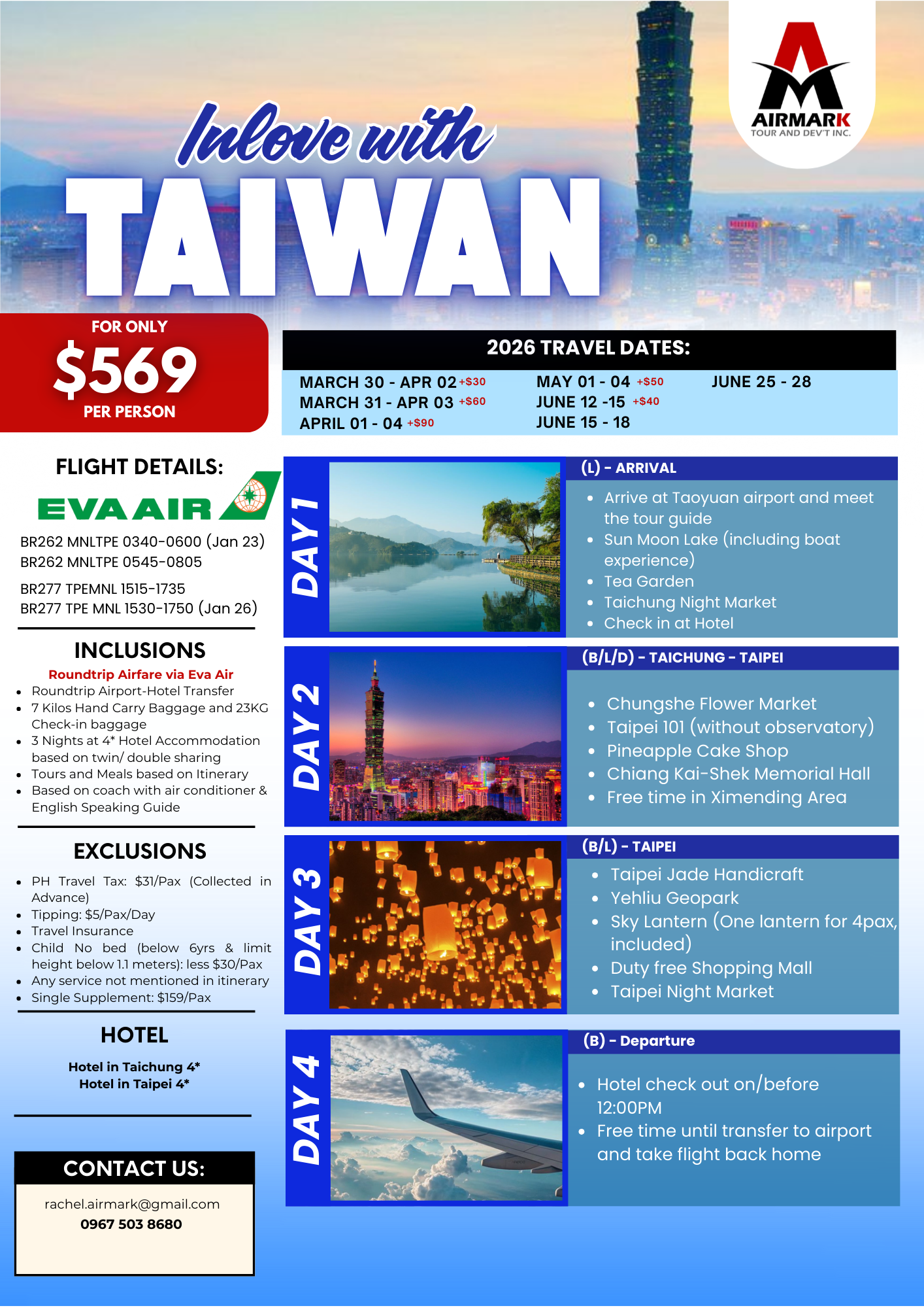 • Roundtrip Airfare via Eva Air;